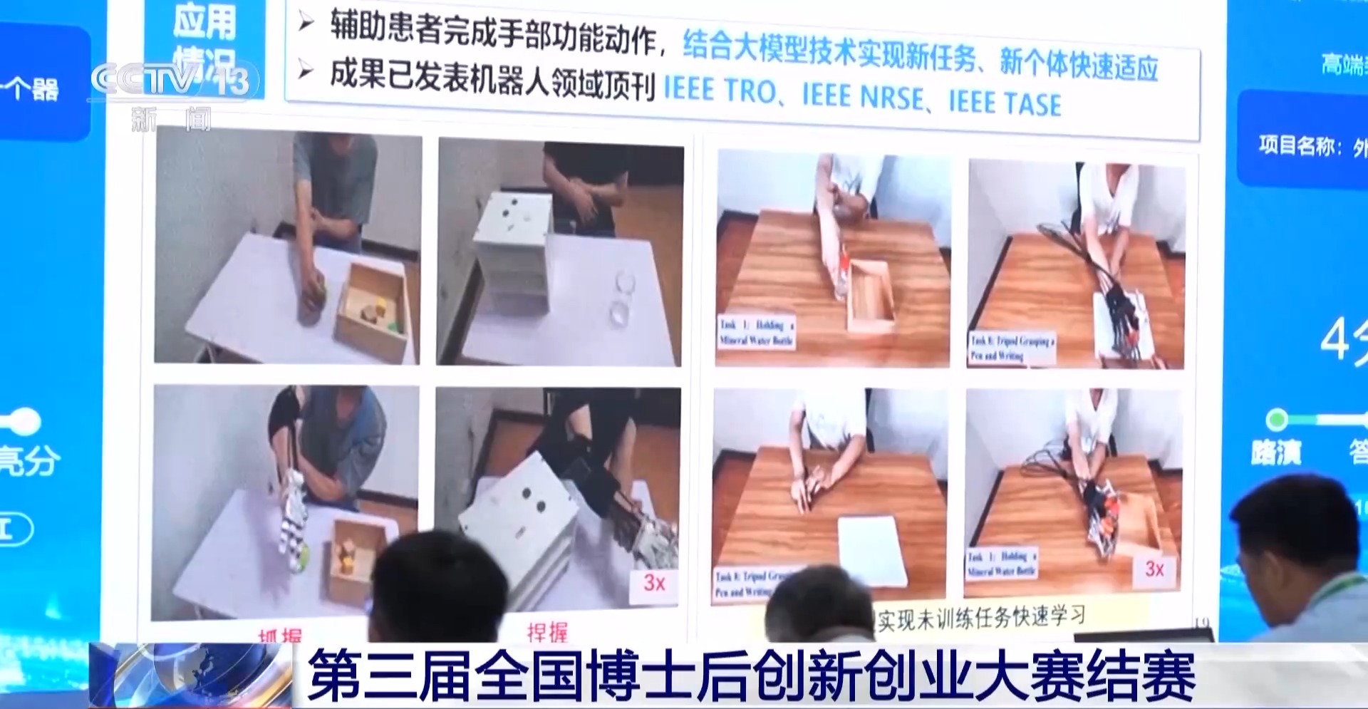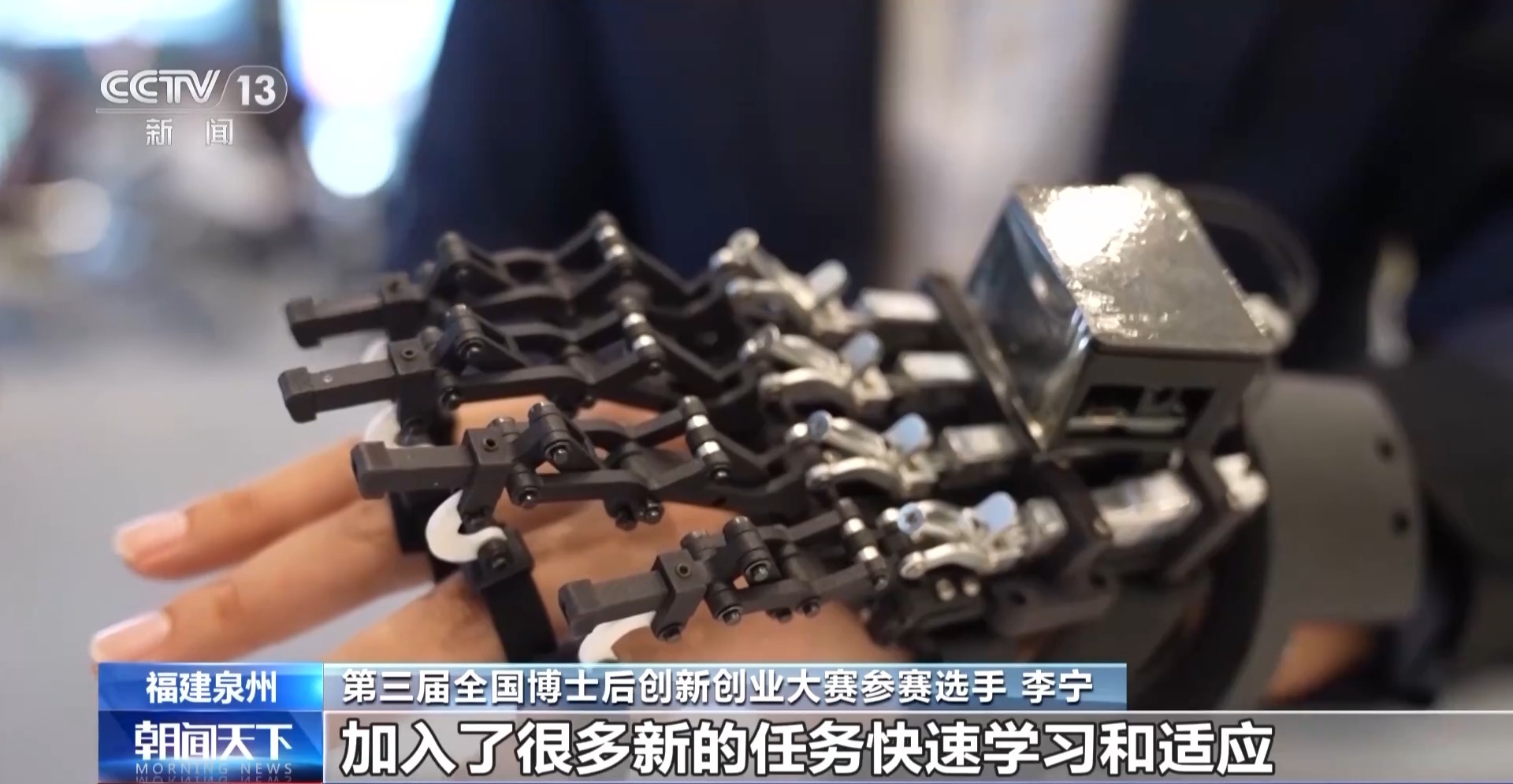 第三届全国博士后创新创业大赛参赛选手 李宁:首先,我们结构上实现了更好的人机共融;第二,实现了怎样获得人运动的意图;第三,在人工智能上加入了很多新的任务快速学习和适应。