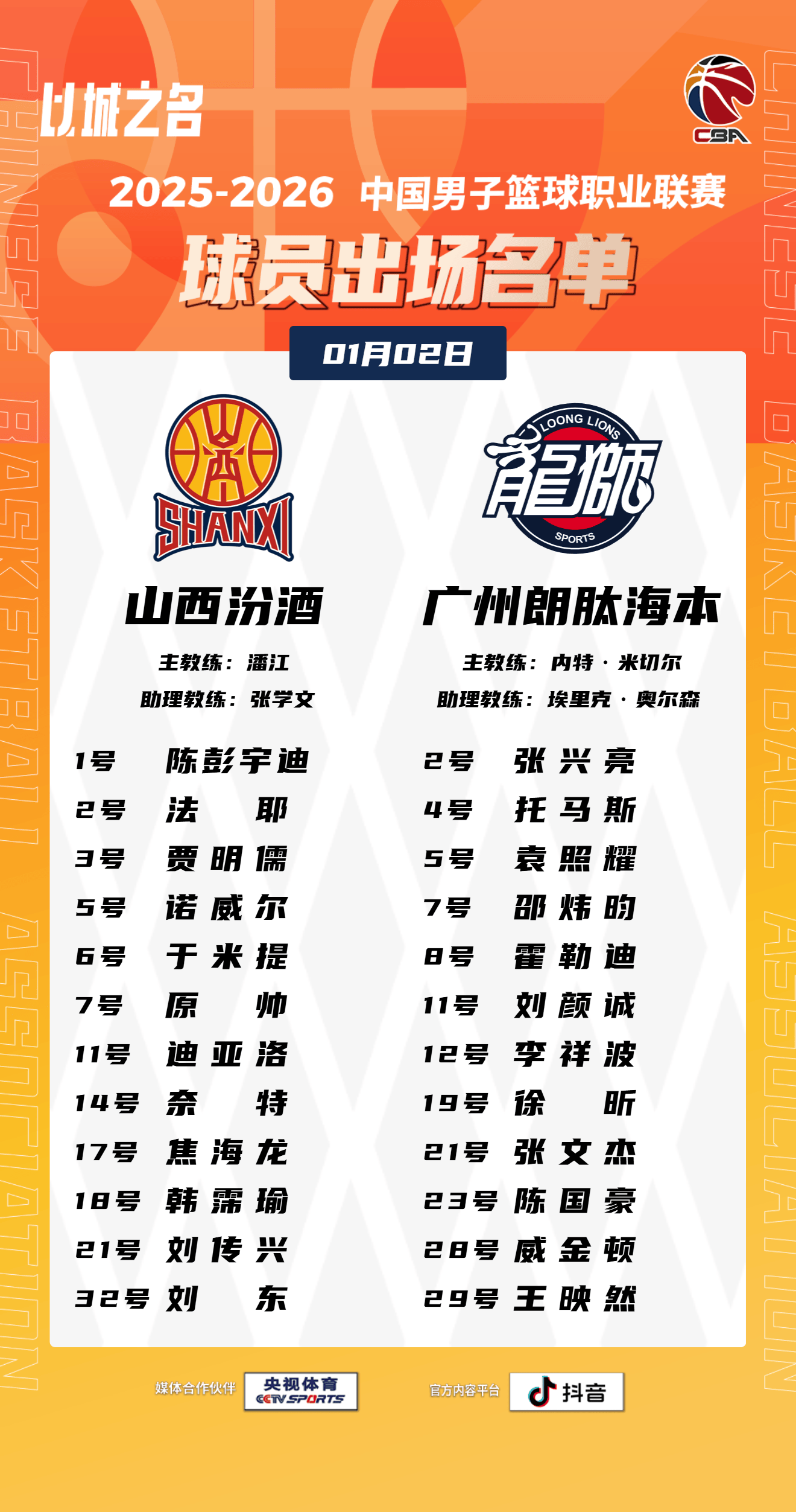 虎扑01月02日讯 今晚CBA常规赛悦配资,山西对阵广州的大名单已经公布。
